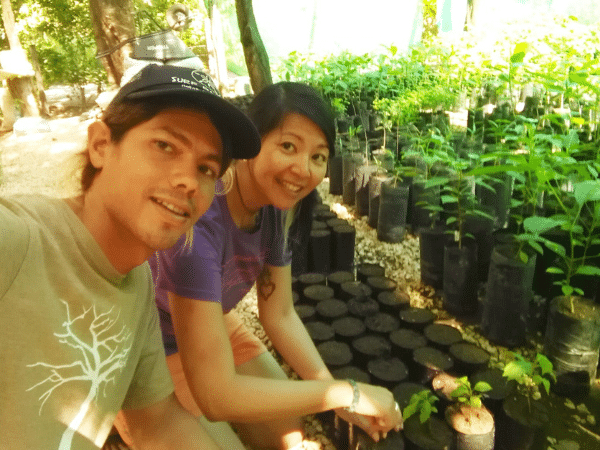 Volunteer (right) with staff member (left) at a reforestation project in Playa Guiones, Costa Rica.